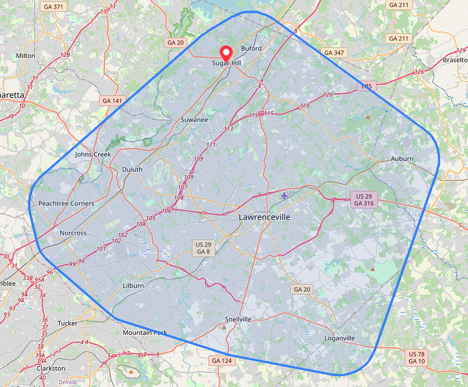 Sugar Hill, and all of Gwinnett and Fulton counties, GA (+100 Miles!)